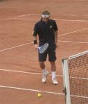 Very impressed by Dan's sliced shots as were those around me. The crowd could have been as many as 20 on the benches and quite a few more on the clubhouse balcony. Score now 4-3 to Dan. Unfortunately the next service game was poor and the break handed back, quickly followed by a game to love by Masson. 5-4. Dan managed to win his service despite being 0-40 down and hit a lovely drop shot that died on the side line. He was questioning one point prompting the following from an observer 'he's so arrogant, thinks he's Federer.' 5-5 Lost the next game after yet another deuce and finally lost his own serve in a pretty lacklustre game, starting with a failed drop shot. Hmm, that reminds me of someone ...