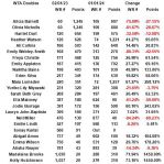 Talia Neilson-Gatenby down 38 to 1484. 1 off from Sharm Katy Dunne up 40 to 1131. 9 from Limmasol Danielle Daley down 8 to 1064. 1 from Monastir Tiffany William down 18 to 988. 1 off from Santo Domingo Nell Miller down 75 to 861. 10 off from Santo Domingo Isabelle Lacy up 175 to 818. 18 from Lousada Eliz Maloney up 50 to 625. 18 from Limmasol replaces 1 Emma Wilson down 19 to 567. 4 off from Lousada replaced by 1 Ella McDonald up 29 to 499. 18 from Lousada Amelia Rajecki down 17 to 432. 10 off from Santo Domingo Samantha Murray Sharan down 4 to 376. 1 from Andorra Heather Watson up 11 to 77. 95 from Andorra replaces 1 Maia Lumsden at 75 . 57 from Andorra replaces 29