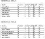 ORDER OF PLAYTuesday 27th AprilMen's Pool ACourt 1 - Not before 17:00Joshua Paris v William NolanCourt 2 - 10:00Luke Johnson v Mason RecciCourt 2 - Not before 17:00Julian Cash v Tom HandsMen's Pool BCourt 1 - Not before 12:30Jack Findel-Hawkins v Dan CoxCourt 1 - Not before 14:00Billy Harris v George HoughtonCourt 2 - Not before 14:00Henry Patten v Jack Gibbens