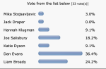 Haha. A little movement from the night owls , Dan moves a vote ahead and Hannah draws equal with Katie. 31 votes now.