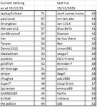 6. LR 182 Dan E 317 7. LR 190 Oliver C 300 - week 47 entry 8. LR 195 Arthur F 288 - week 48 entry 9. LR 196 Jack PJ 287 10. LR 197 Ryan P 287 - 25 ( net 21 ) points to drop on 01/12 11. LR 206 George L 280 - week 47 & 48 entries 12. LR 210 Jay C 273 - week 47 & 48 entries 13. LR 234 Johannus M 243