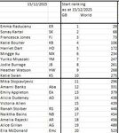Select 10 players and give your prediction of their end-of season GB ranking and world ranking. As in the 2025 competition one substitute player is allowed, who must be named as such at the same time as the main selection of 10. Their predicted WR must also be given. The eleventh player may be substituted for any one of your main selections, but only in the two weeks immediately following the end of Wimbledon (i.e. 14th to 26th July only, to be confirmed precisely nearer the time). This will give a little flexibility, particularly in the case of long-term injuries, and will make it more interesting. The substitute will take your prediction of the GB ranking of the player they replace, so for example if you replaced Harriet Dart (GB #5) with Hannah Klugman (GB #22), Hannah would become your #5 prediction so think carefully ! Continuing from last year, there will be two dummy entries, AsYouWere (based on the starting rankings) and Mr Average (based on everyones WR predictions).